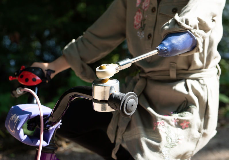 En cykelanordning er et enkelt protesehylster, som er formet efter armstumpen. Protese-hylsteret monteres i forlængelse af en styrepind, som er monteret på cykelstyret med et kugleled. Der tages altid højde for, at armstumpen er let at få ud af protesehylsteret igen ved tegngivning i trafikken eller i tilfælde af uheld, og cyklen vælter. Anordningen kan tages af og flyttes til anden cykel, hvis du har behov for det, og fås i mange farver.